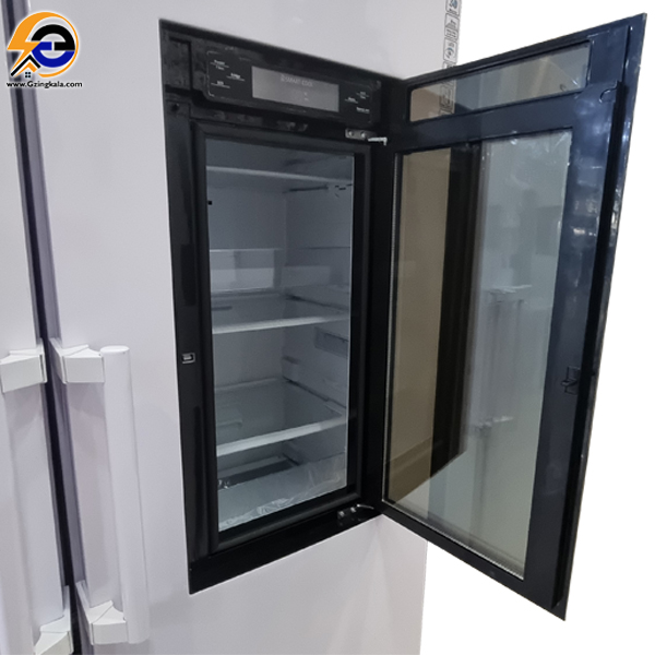 در بخش یخچال، ظرفیت ۴۴۸ لیتری را در اختیار دارید که شامل ۵ طبقه شیشه ای می باشد و شما می توانید این طبقات را به راحتی جابجا کنید. ضمن اینکه در پایین این طبقات دو کشوی مخصوص نگهداری میوه و سبزیجات قرار داده شده است. بر روی درب هم ۴ طبقه ی بزرگ مخصوص نگهداری لبنیات تعبیه شده است. این یخچال دونار دارای دستگیره ی اهرمی Easy Open Handle است. این دستگیره به گونه ای طراحی شده که با کشیدن، کمی فشار به بین درب و بدنه ی یخچال وارد می کند که همین باعث باز شدن راحت تر درب می شود. شما روی درب یخچال، یک درب آینه ای مشاهده می کنید که طراحی آن را زیباتر کرده است. این درب آینه ای با فشار دست باز می شود و می توانید از طریق آن به وسایل درون یخچال دسترسی داشته باشید. برای دسترسی به پنل یخچال نیز باید درب آینه ای را باز کنید.