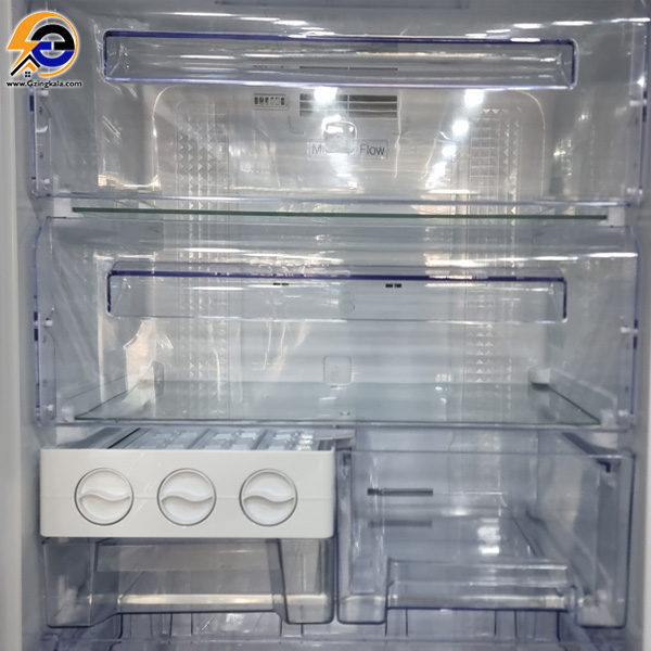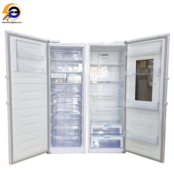 فریزر این محصول دارای ظرفیت ۳۵۶ لیتر است که اجزای داخلی آن شامل ۹ کشو بزرگ از جنس پلاستیک ABS می باشد. طبات این فریر کشویی هستند و به راحتی می توانید آن ها را خارج کرده و نظافت کتید. روی درب فریزر دو عدد قفسه وجود دارد که می توانید برای نگهداری مواد غذایی کوچک از آن ها استفاده کنید. فریزر این محصول متاسفانه امکان اتصاب به آب شهری را ندارد و شما باید محفظه ی یخ ساز را به صورت دستی پر کنید. این یخ ساز امکان تولید یخ حبه ای دارد و شما به راحتی می توانید یخ ها را داخل کشو مخصوص نگهداری یخ خالی کنید. کنترل پنل آن بر روی درب فریزر قرار دارد که می توانید تنظیمات دما را از طریق آن انجام دهید.